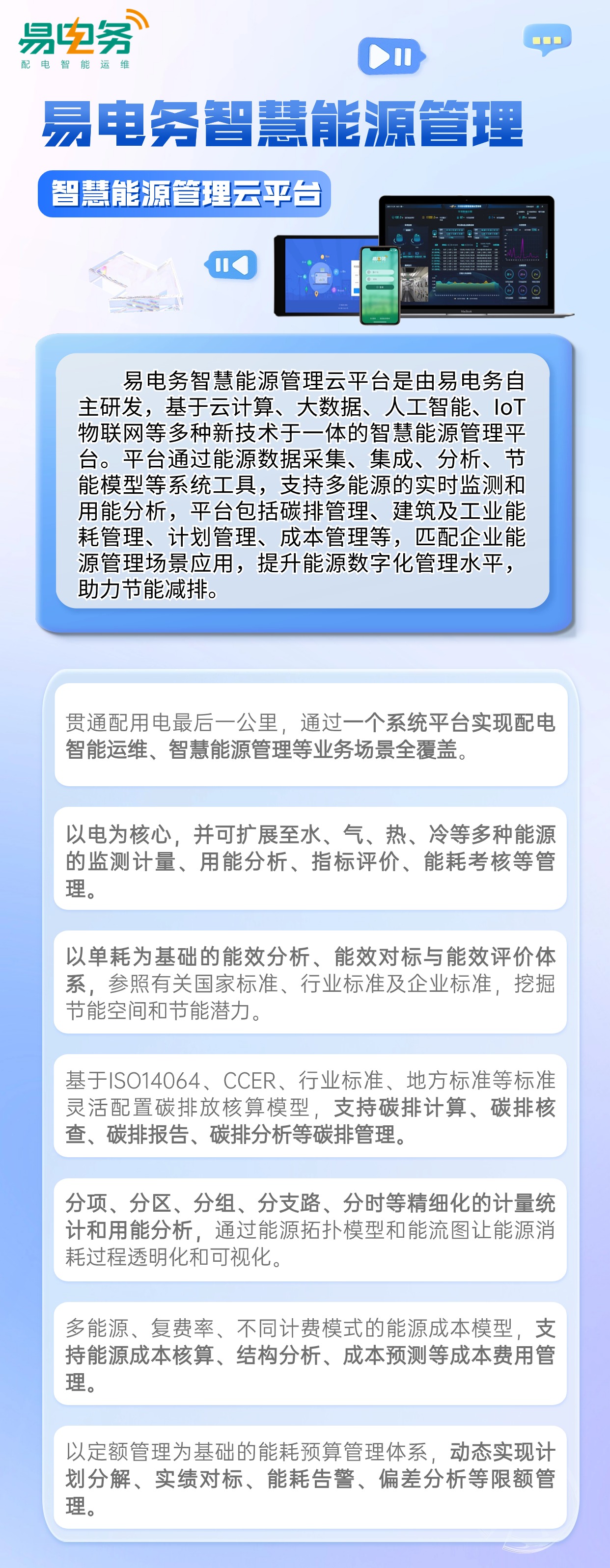 在智能配电管理业务之外,易电务智慧能源管理云平台还可为企业快速构建一套完善的能碳管理系统及能耗考核体系,助力企业通过云平台实现能耗及碳排放数据的实时监测、分析、预警、报告等,提升数据质量管理,支撑企业节能减碳、控制成本等能源管理策略,提升企业能源数字化管理水平!