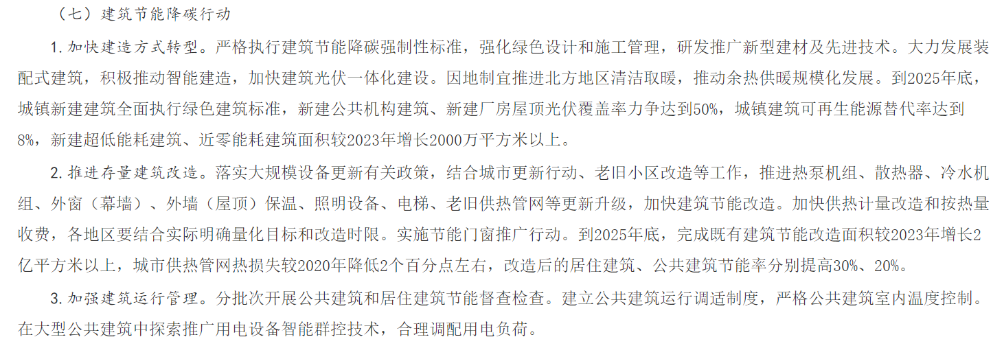 对于建筑节能降碳行动中,《行动方案》提出要加快建造方式转型,推进存量建筑改造,加强建筑运行管理。特别是在大型公共建筑中探索推广用电设备智能群控技术,合理调配用电负荷。