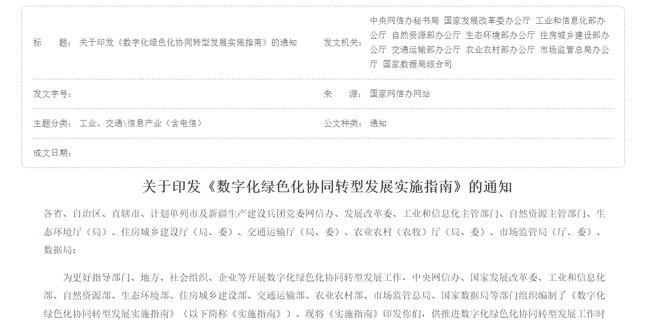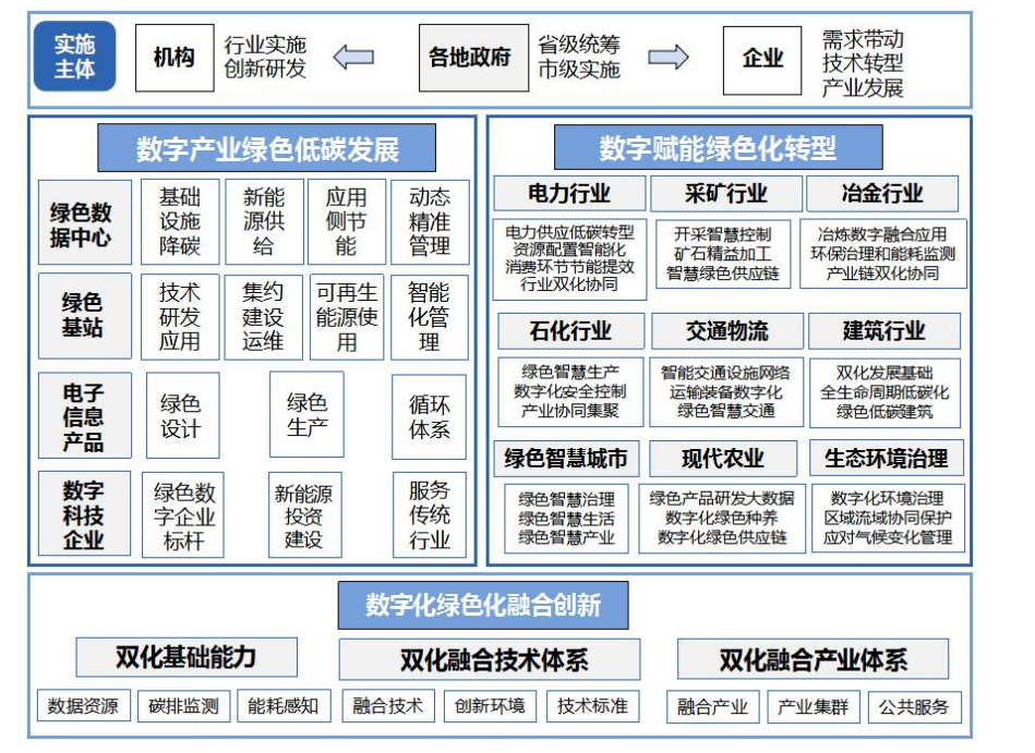 《双化协同指南》指明了双化协同两大发力方向:一是要加快数字产业绿色低碳发展,推动数据中心、通信基站、电子信息产品等关键领域的绿色化转型。二是要发挥数字科技企业创新作用,促进电力、采矿、冶金、石化、交通、建筑、城市、农业、生态等九个重点领域的绿色化转型。