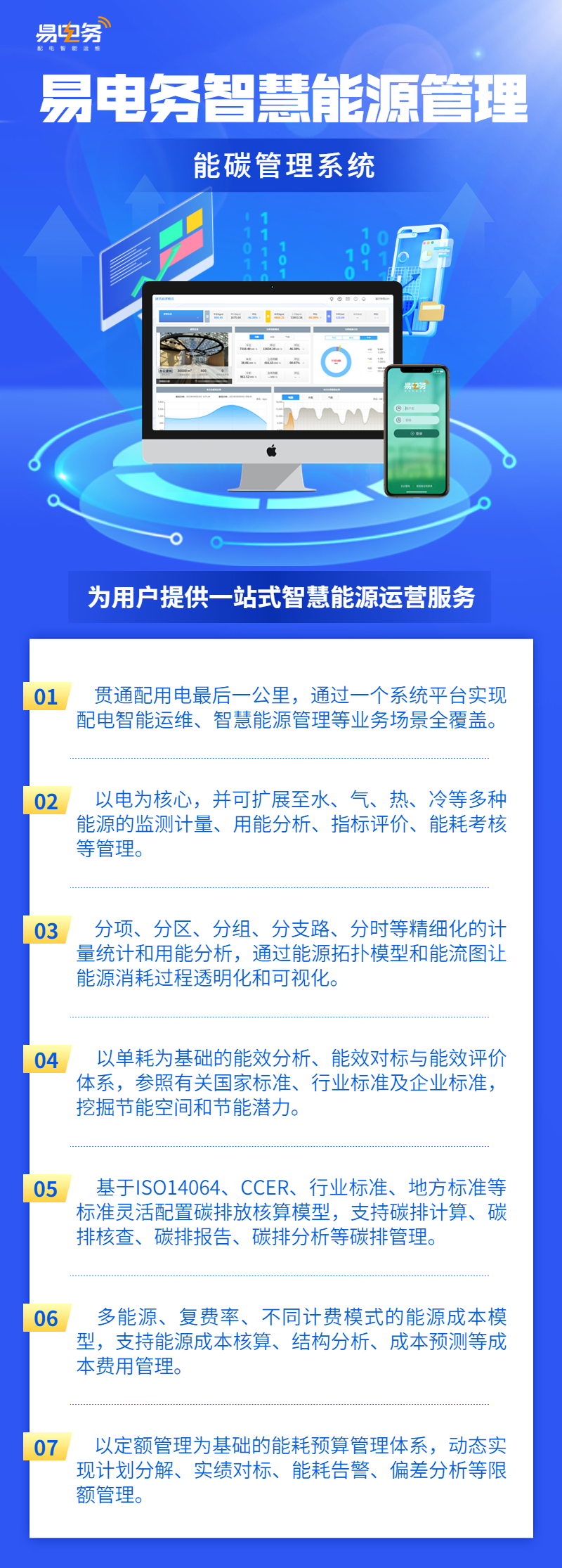 易电务智慧能源管理平台是将云计算、物联网、大数据技术与园区、建筑、工厂能源管理运营业务相结合的数字化服务平台,通过对园区、建筑、工厂等电气设备及末端用电、水、气等用能设备的数字化改造并接入智慧能源管理系统平台,实现对能源使用全过程实时监测和智能控制,帮助企业精准掌握能耗情况,挖掘节能潜力。同时,易电务能源管理平台还具备强大的数据分析能力,能够为企业提供定制化的能源管理解决方案,助力企业快速实现数字化、绿色化协同转型。