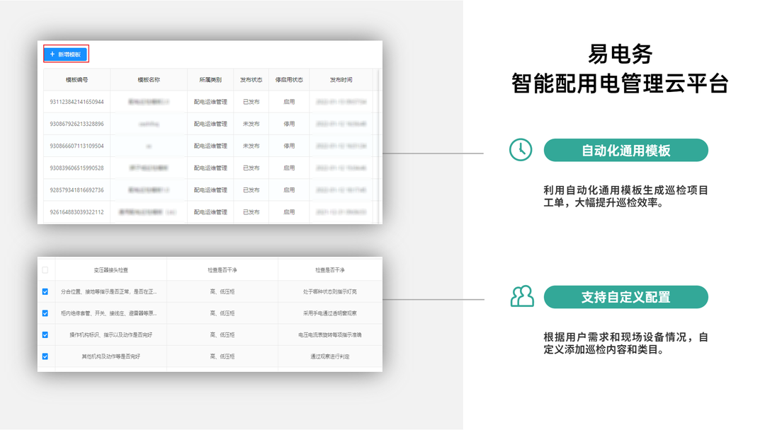 系统平台根据项目站点自动生成通用巡检模板,可以对高、低压柜、变压器、直流屏、环境、安全器具等设备和巡检项进行分类,并可关联各回路及具体检查事项,使日常巡检变得更加方便、全面、条理,再也不用担心以往依靠人工经验巡检而产生的错检、漏检等。